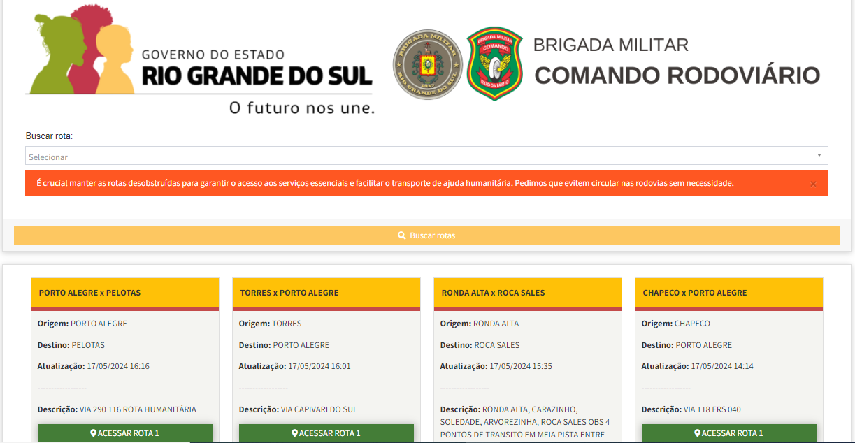 Reforçamos o mapa interativo, de fácil navegação, que possibilita aos usuários clicarem nos pontos de interesse para obter informações detalhadas sobre cada trecho. Os dados são atualizados constantemente pelo Departamento Autônomo de Estradas de Rodagem (Daer), com base nas informações fornecidas pela Polícia Rodoviária Federal, Comando Rodoviário da Brigada Militar e concessionárias de rodovias: https://bit.ly/4ahoPia