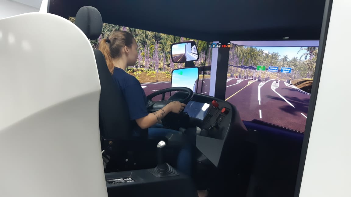 Após o bate-papo, os alunos conheceram o simulador de direção que é tecnologia de ponta a serviço da qualificação profissional para o transporte. A prática no equipamento faz parte do treinamento de motoristas de cargas e de passageiros e dá aos alunos experiência para enfrentar desafios reais da profissão.