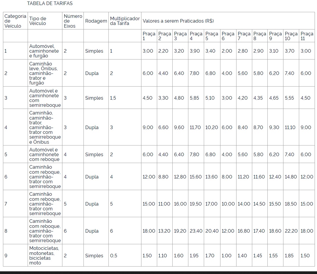 A deliberação mantém a Tarifa Básica de Pedágio quilométrica contratual em R$0,03050 e altera a TBP quilométrica acumulada de R$ 0,00035 para R$0,000127. O reajuste também corresponde à variação do Índice de Preços ao Consumidor Amplo – IPCA, que indicou percentual positivo de 6,33%, dessa forma, a TBP, atualizada após arredondamento, será alterada, nas praças de pedágio P1, em Alexânia/GO, P2, em Goianápolis/GO, P3, em Piracanjuba/Professor Jamil/GO, P4, em Itumbiara/GO, P5, em Prata/MG, P6, em Fronteira/Frutal/MG, P7, em Florestal/Pará de Minas/MG, P8, em Luz/MG, P9, em campos Altos/MG, P10, em Perdizes/MG e P11, em Campo Florido/Conceição das Alagoas/Veríssimo/MG, na forma da tabela anexa: