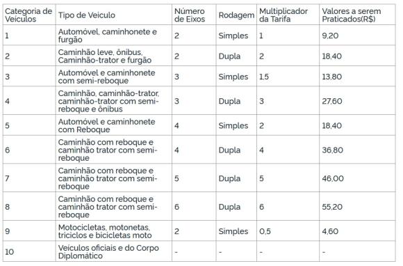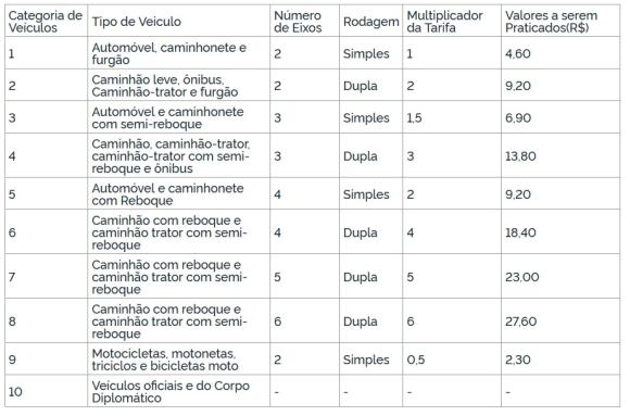 O reajuste aprovado é de 4,31%, correspondente à variação do Índice de Preços ao Consumidor Amplo (IPCA). Os carros deixarão de pagar R$ 4,40 e passarão a gastar R$ 4,60 nas praças de Três Cachoeiras, na BR-101; Gravataí, na freeway; e Montenegro, Paverama, Fontoura Xavier e Victor Graeff, na BR-386. Motos pagarão R$ 2,30. Caminhões gastarão entre R$ 9,20 e R$ 27,60 dependendo da quantidade de eixos.