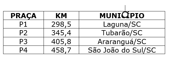 Praças de Pedágio – Foi definido para o sistema rodoviário um esquema de pedagiamento com quatro praças, conforme tabela a seguir: