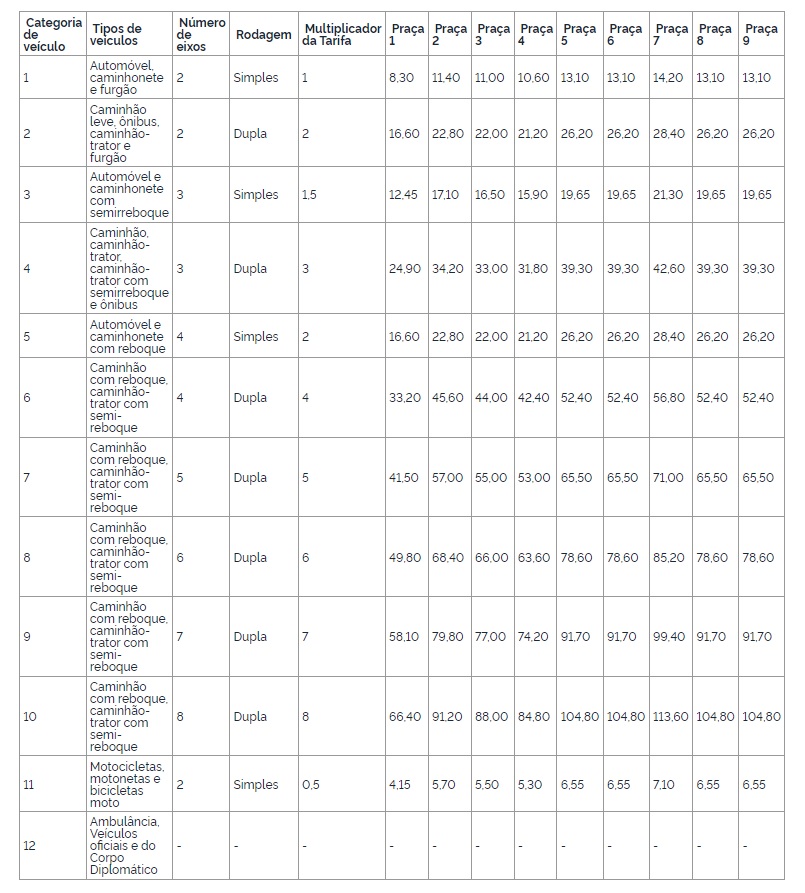 Após os reajustes e arredondamentos, a Tarifa Básica de Pedágio, como indica a tabela anexa, passa a operar, para a categoria 1 de veículos, de R$ 8,30 na Praça de Pedágio P1 em Aliança do Tocantins/TO, R$ 11,40 na Praça de Pedágio P2 em Alvorada/TO, R$ 11,00 na Praça de Pedágio P3 em Porangatu/GO, R$ 10,60 na Praça de Pedágio P4 em Estrela do Norte/GO, R$ 13,10 nas Praças de Pedágio P5 em Campinorte/GO, P6 em Hidrolina/GO, P8 em Santa Rita do Novo Destino/GO, e P9 em Corumbá de Goiás/GO, e R$ 14,20 na Praça de Pedágio P7 em Jaraguá/GO.