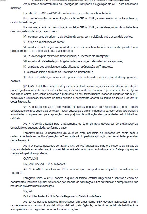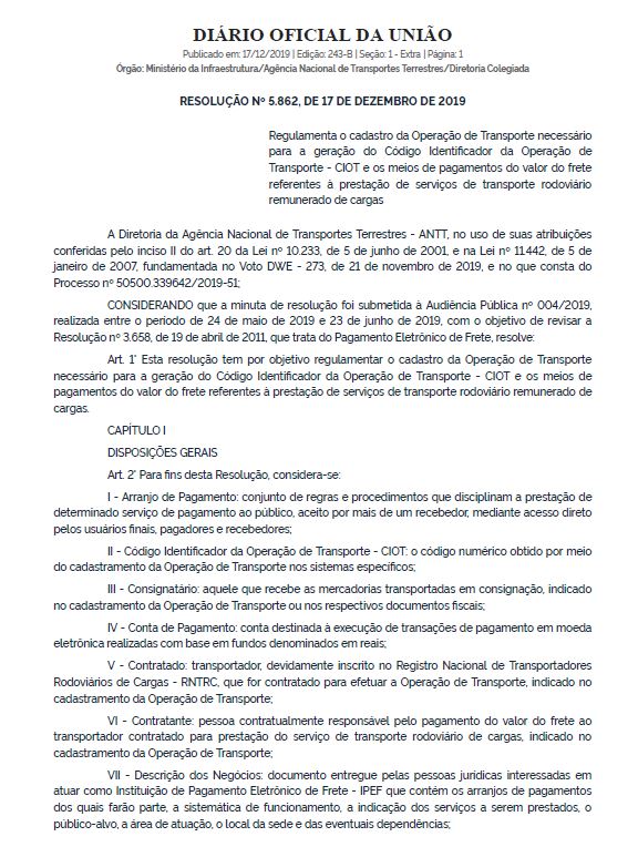 Está publicado no Diário Oficial da União do dia 17/12/2019, a Resolução 5.862 que obriga a geração do CIOT para toda e qualquer operação de transporte, inclusive para aquela feita com caminhão pertencente à frota própria de uma transportadora. Até a publicação da Resolução, esta geração se aplicava somente quando da subcontratação de autônomo (TAC) e TAC-equiparado.