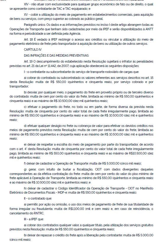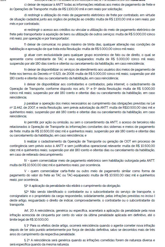 Estão previstas multas que variam de R$ 550,00 à R$ 10.500,00, podendo haver a suspensão do RNTRC para quem for reincidente e descumprir as regras estabelecidas por esta Resolução.