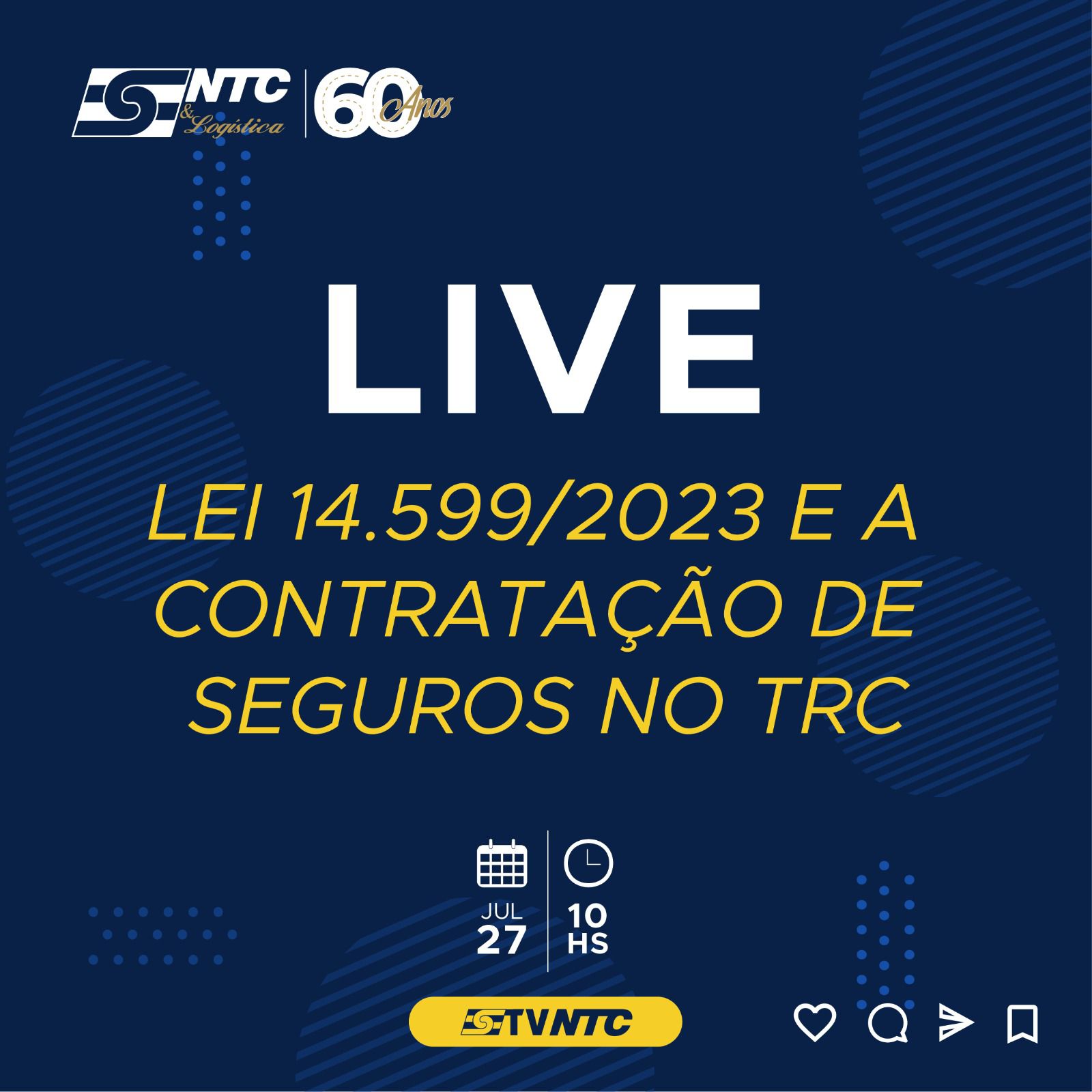 A ntc&logística promoverá na próxima quinta-feira,dia 27 de julho de 2023, a partir das 10h, uma live para tirar dúvidas dos transportadores, entidades associadas e parceiros comerciais sobre a Lei do Seguro 14.599/2023 e a Contratação de seguros no trc. Na oportunidade irá reunir seus renomados técnicos, onde irão explicar o a Lei e o trabalho desenvolvido pela entidade com os entes