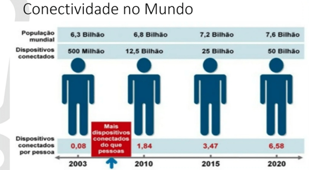 Na última década, a média de dispositivos conectados por habitante no mundo evoluiu de 1,84 para 6,58 dispositivos/habitante. Hoje existem mais de 50 bilhões de dispositivos conectados pela internet. Isto é incrível!