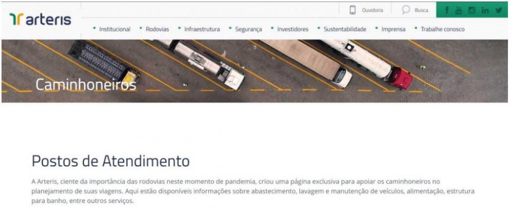 Para auxiliar caminhoneiros durante a pandemia da covid-19, a Arteris, uma das maiores empresas de concessões rodoviárias do País, lança um site com os postos em funcionamento nas rodovias administradas pela empresa. Na página www.arteris.com.br/caminhoneiro, que será atualizada diariamente, o motorista terá informações sobre serviços de alimentação, descanso, vestiário e suporte de manutenção aos veículos. São mais de 400 estabelecimentos parceiros nos 3.400 km de rodovias em cinco estados brasileiros administrados pela empresa. O site é aberto a todos os públicos.