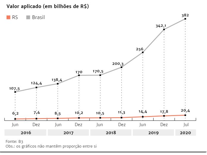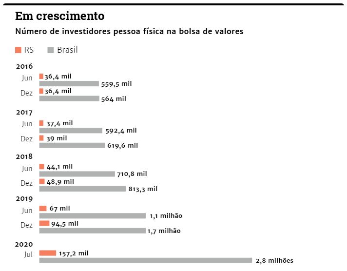 A alta verificada entre os gaúchos espelha o cenário nacional. Em julho, o número de investidores chegou a 2,8 milhões no país. Corresponde a avanço de 68,2% em relação a dezembro. Ou seja, houve cerca de 1,1 milhão de novos registros ao longo de 2020.