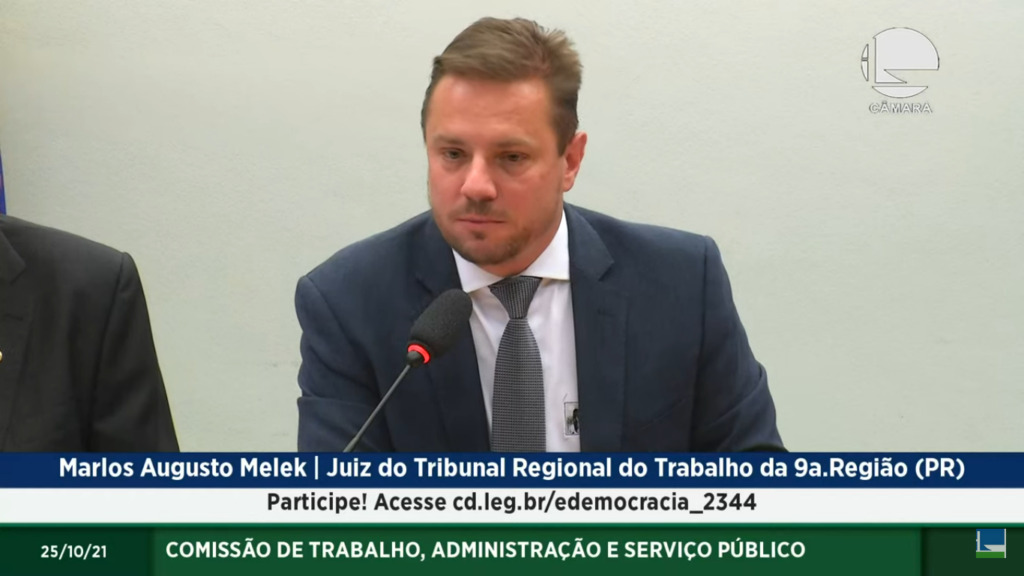 Melek começou a sua apresentação, expondo o cenário de avanço da tecnologia no mundo do trabalho nos próximos anos. Segundo o Juiz, no Brasil, há no país, segundo o Instituto Brasileiro de Geografia e Estatística (IBGE), mais de 14 milhões de brasileiros desempregados. As justificativas para o dado, de acordo com Marlos, ocorrem, sobretudo, por causa dos custos elevados de encargos trabalhistas assumidos pela empresa durante a contratação. Na sua opinião, se mantidos esses parâmetros, o setor privado será obrigado a substituir a mão de obra física pela robótica e muitos empregos perderão espaço para o avanço da Inteligência Artificial (IA).