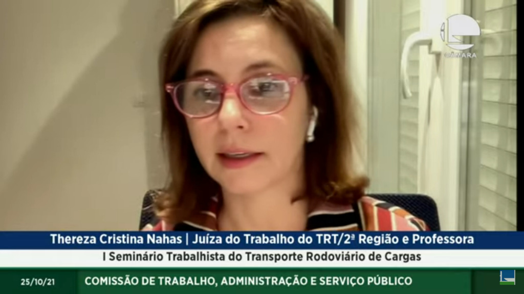 Inicialmente incluído entre os debatedores, o presidente da Confederação Nacional Trabalhadores em Transportes Terrestres, Jaime Bueno Aguiar, não esteve presente por motivos de saúde. Mesmo assim, o seminário continuou com a juíza da 2ª Região do TRT, Thereza Christina Nahas e, assim, iniciou-se o painel sobre a regulamentação do teletrabalho.