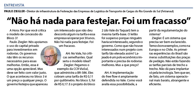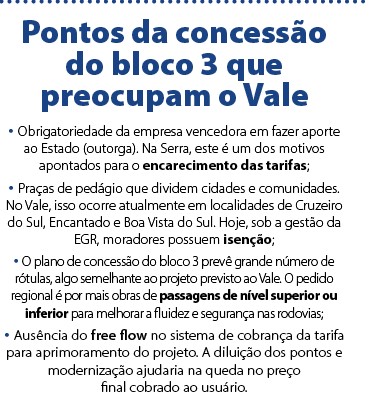 Enquanto o Vale do Taqua­ri aguarda por um proje­to que contemple as ne­cessidades locais, outras regiões buscam reverter pontos de um contrato de 30 anos. Desde o dia 1º, as rodovias do Bloco 3 do plano de concessões estão sob nova direção. E os primeiros dias têm sido de dúvidas, incertezas e críti­cas da comunidade, gestores públi­cos e do setor produtivo.
