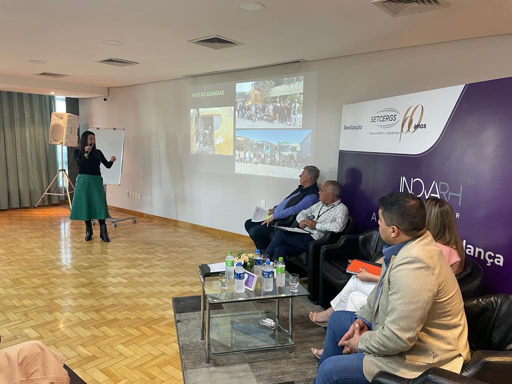 Taís Lorenz que faz parte da diretoria do Sistema Fetransul e da Comissão do INOVARH, falou para o grupo sobre as ações desenvolvidas em parceria com o SEST SENAT que tem como objetivo principal a atração e sensibilização dos jovens com a profissão motorista.