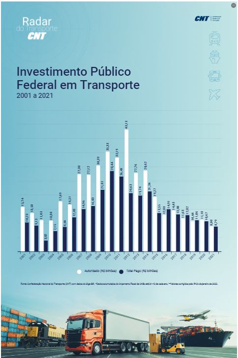 A exemplo de anos anteriores, o baixo investimento do governo federal em infraestrutura para o transporte sofreu uma nova queda e passou de R$ 8,69 bilhões, em 2021, para R$ 8,58 bilhões, em 2022. A quantia representa apenas 20% dos R$ 42,90 bilhões autorizados pela União em 2012, ano com a maior cifra em duas décadas.