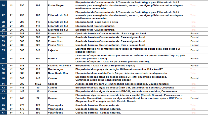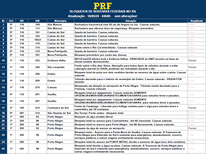 A Polícia Rodoviária Federal (PRF), está informando diariamente os bloqueios e liberações das rodovias federais do Estado do Rio Grande do Sul. A última atualização foi feita hoje (16) às 04h:
