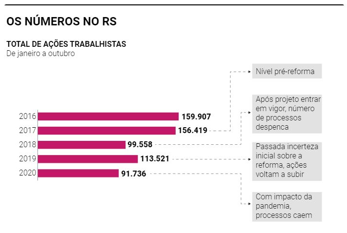 De janeiro a outubro de 2020, as varas do Estado contabilizaram 91,7 mil ações trabalhistas. Em igual período de 2017, antes da reforma, o número havia sido maior: 156,4 mil. A queda de 41,4% resulta dessa comparação. Ou seja, houve decréscimo de 64,7 mil processos. GZH buscou os dados junto ao Tribunal Regional do Trabalho (TRT) da 4ª Região, sediado em Porto Alegre.