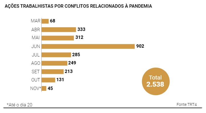 Parte das ações trabalhistas registradas em 2020, no Estado, tem relação com a pandemia. Desde o começo de março até a última sexta-feira, o Rio Grande do Sul somou 2,5 mil processos por questões ligadas à crise da covid-19. O dado aparece em painel do Tribunal Regional do Trabalho da 4ª Região (TRT4).