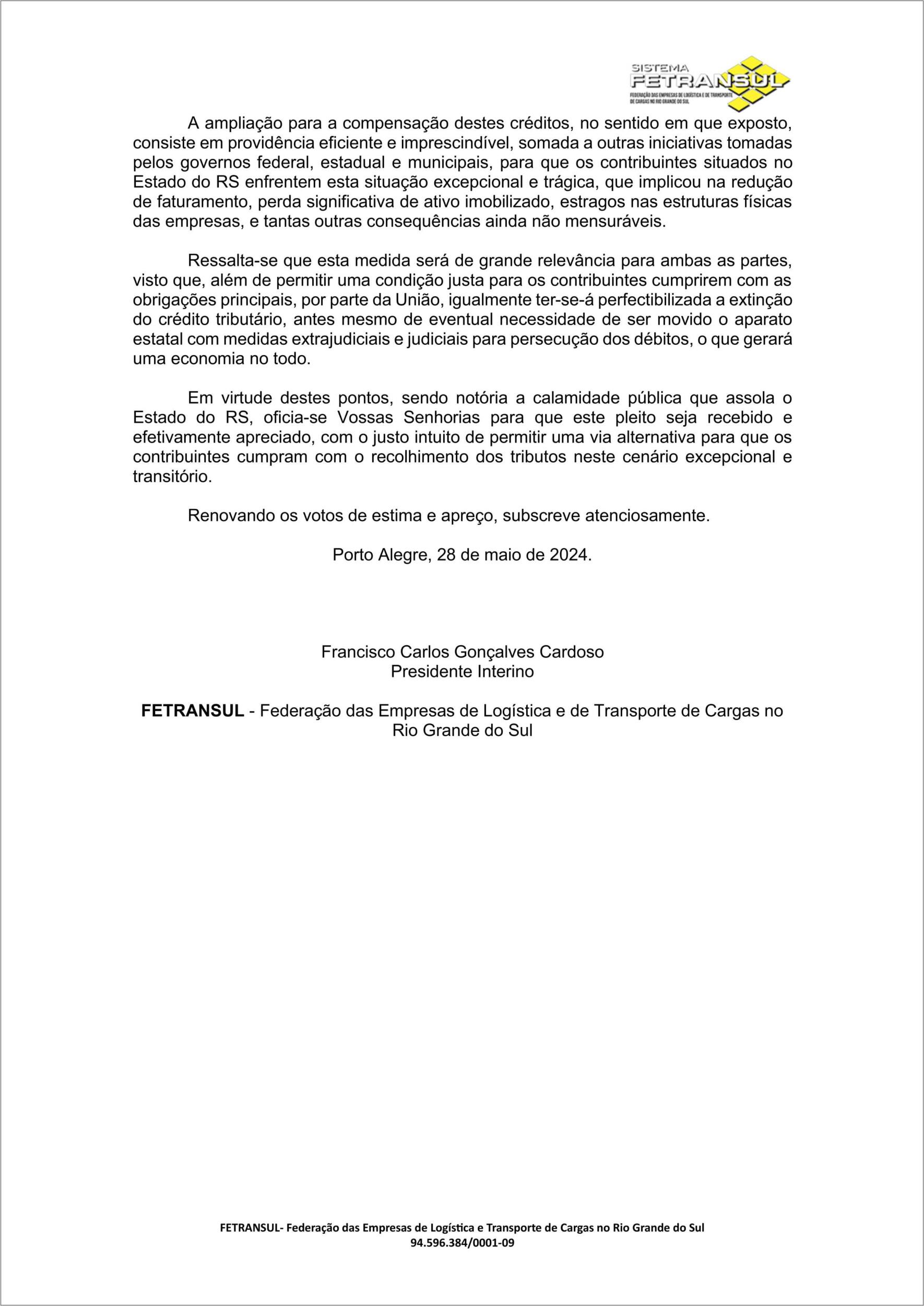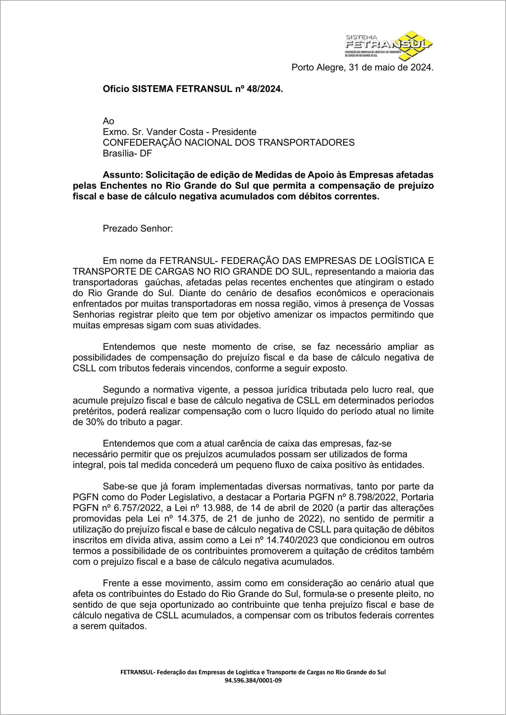Sistema Fetransul encaminha ofício à CNT com solicitação de edição de Medidas de Apoio às Empresas afetadas pelas Enchentes no RS