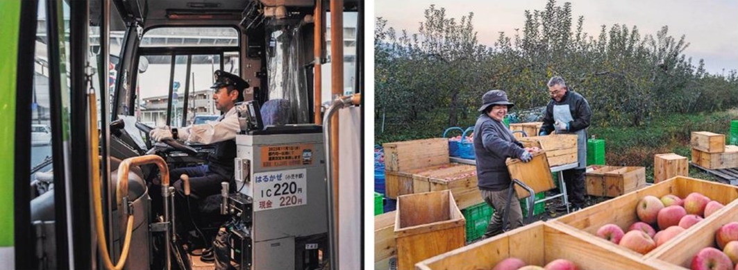 Acima, na página anterior, Daiki Funamizu verifica documentos em Aomori antes de transportar uma carga de maçãs. Abaixo, à direita, Rikako Naraki e seu irmão, Shoji, em sua fazenda em Aomori. Abaixo, à esquerda, motoristas de ônibus também serão afetados pela regulamentação de horas extras.